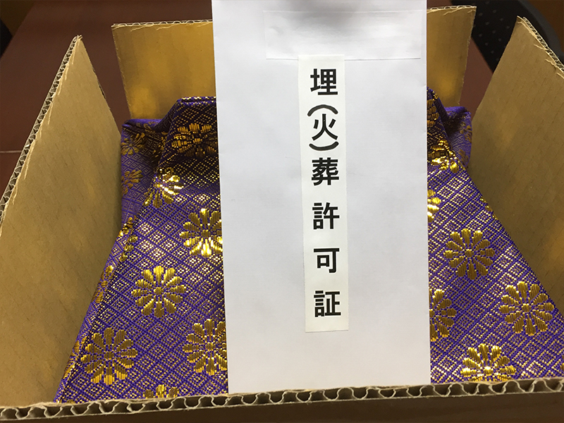 「ご遺骨」と「埋(火)葬許可証」をダンボールに入れてください。